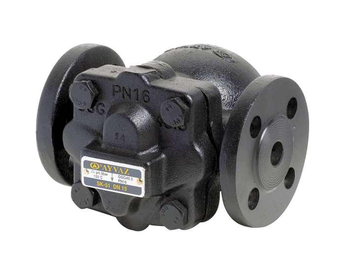Automatic air vent with float, ductile iron body (EN-GJS-400-18), built-in thermostatic air vent, PS: 16 bar, TS: 250°C, flanged.
