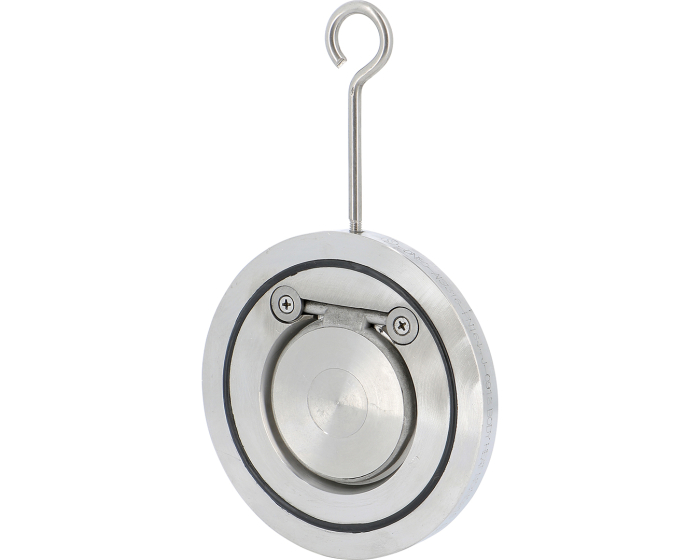 Single plate wafer swing check valve The wafer swing check valve with a single plate is commonly used in heating systems, water distribution networks or irrigation systems. With its compact design, this device is an economic solution made up of carbon steel or stainless-steel. It is designed with a monobloc body drilled by a hole in its centre. A disc sustained by a stem closes the valve in case of backflow. This construction gives a good mechanical resistance, and the integrated body gaskets (EPDM, NBR or FKM according to executions) ensure the tightness. It is also provided with a hoisting eye to allow a proper mounting. The single plate wafer swing check valves of our range are designed to be mounted between flanges PN16 and set up in a horizontal position, or in a vertical position, with an ascending fluid. They tolerate a 16-bar pressure up to DN200 and a 10-bar pressure for larger sizes, while allowing a wide range of temperatures depending on the different materials: from -10 °C to +180 °C. All our references comply with the directive 2014/68/EU. Good to know: this type of check valve must not be used with pulsatory pace systems. They allow a 3m/s speed.